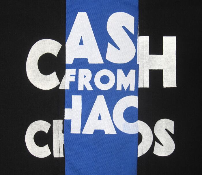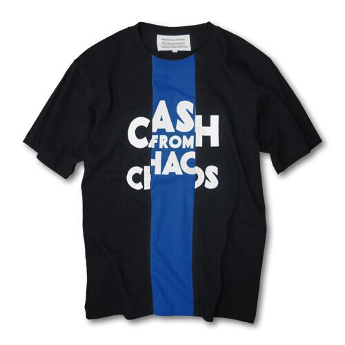 本家セッズの"CASH FROM CHAOS"Tシャツのセンター部分を配色で切替え、さらにスライドさせた視覚的にも遊びを利かせたデザイン。