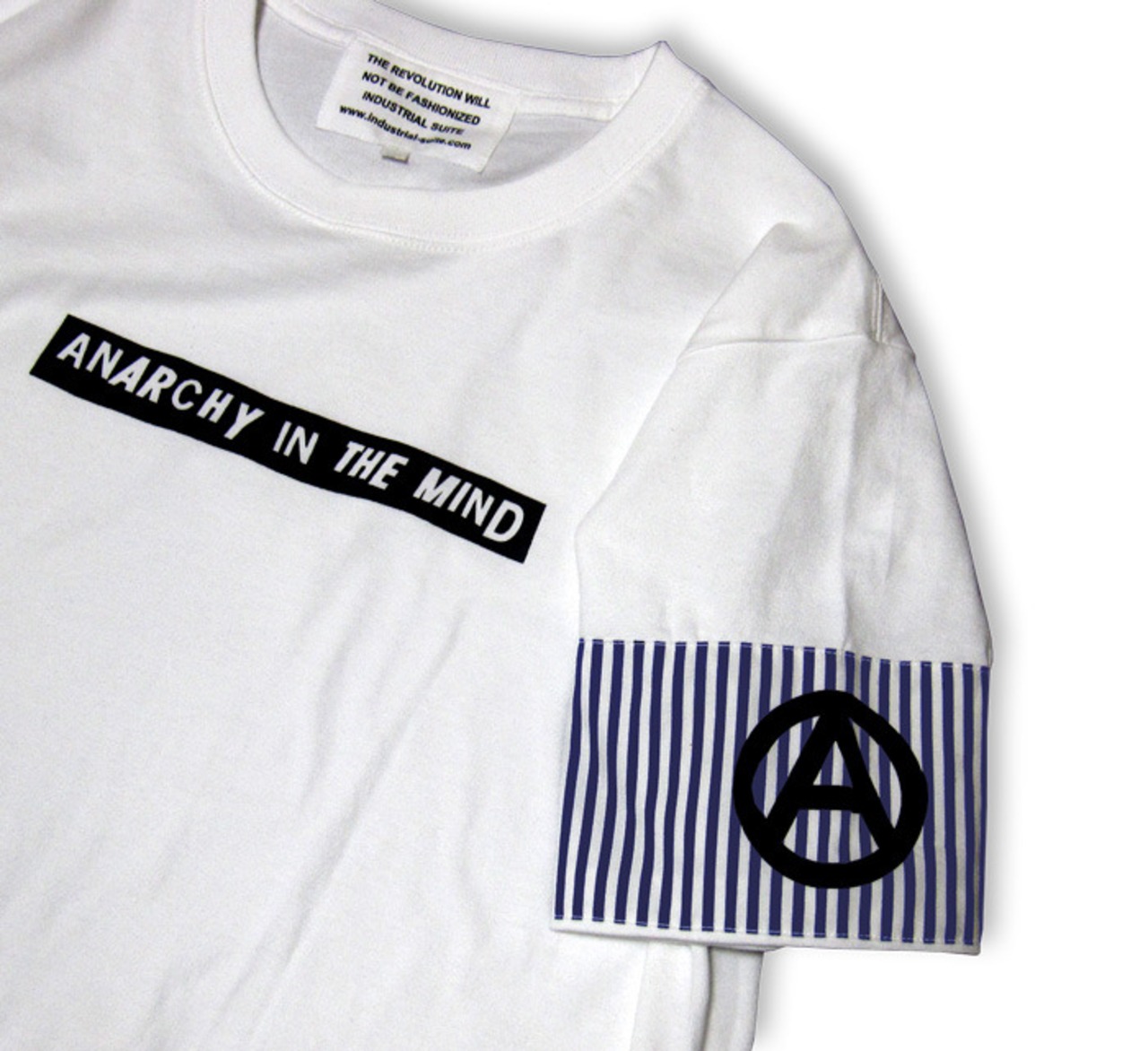 ロンドンストライプにサークルAプリントが施されたアームバンドが目を惹くアナーキーTシャツ(アームバンドは縫い付けてあります)